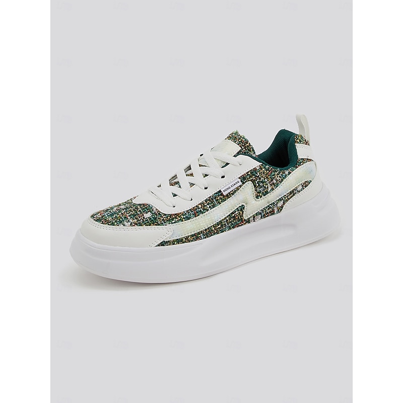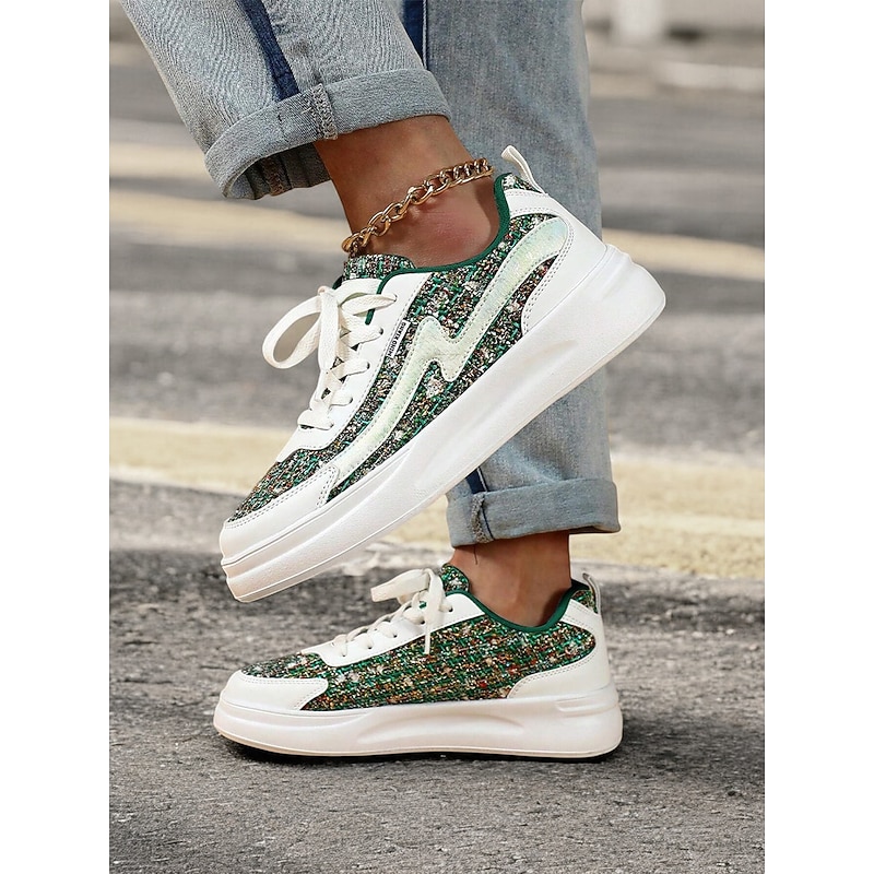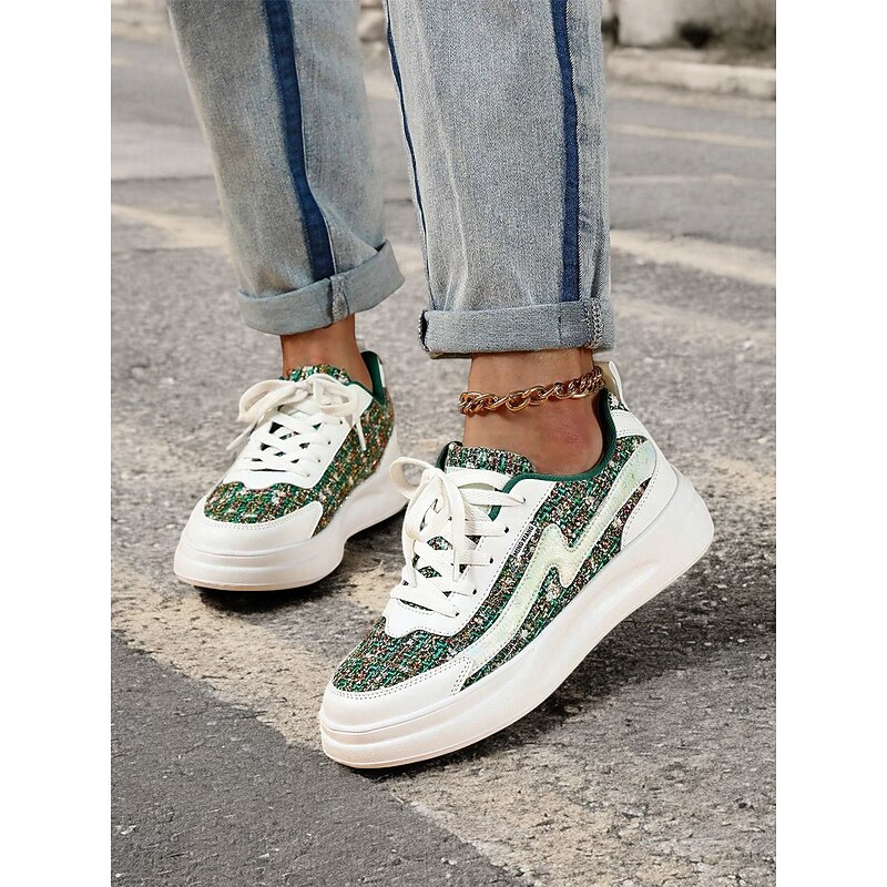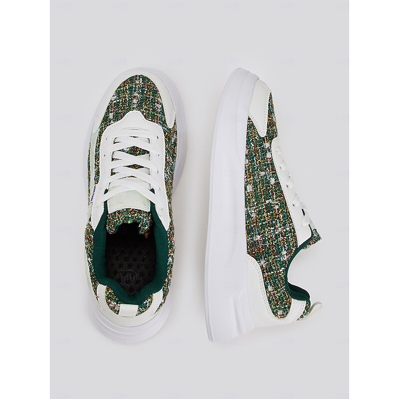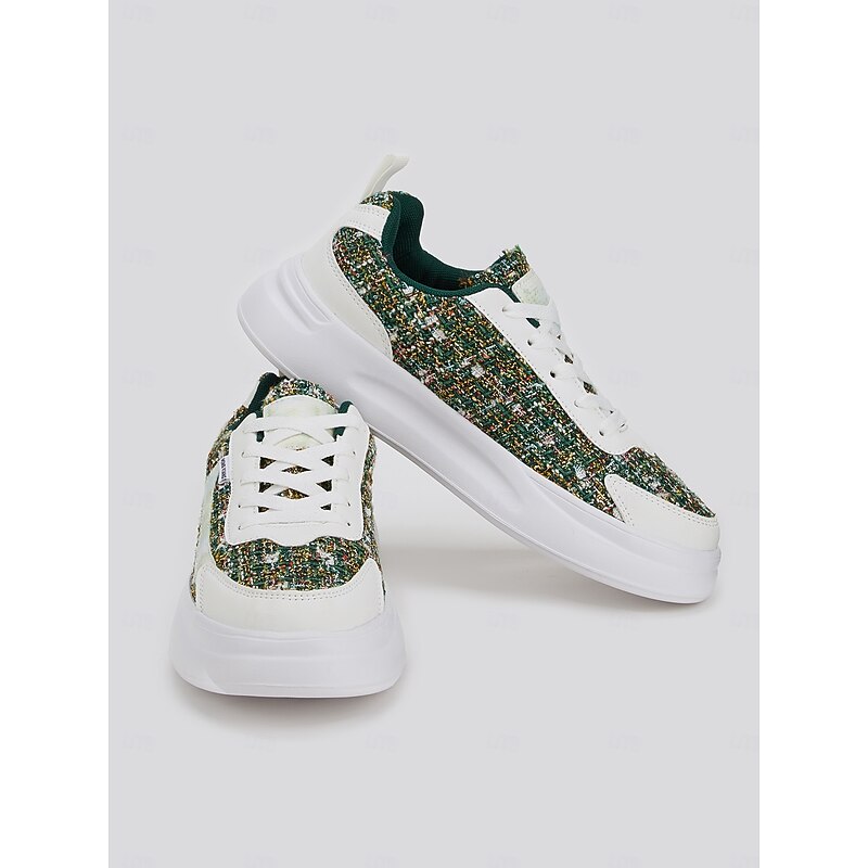 Women's Green Tweed Sneakers – contemporary Lace-Up Casual Shoes with cushy White Soles for Everyday Fashion