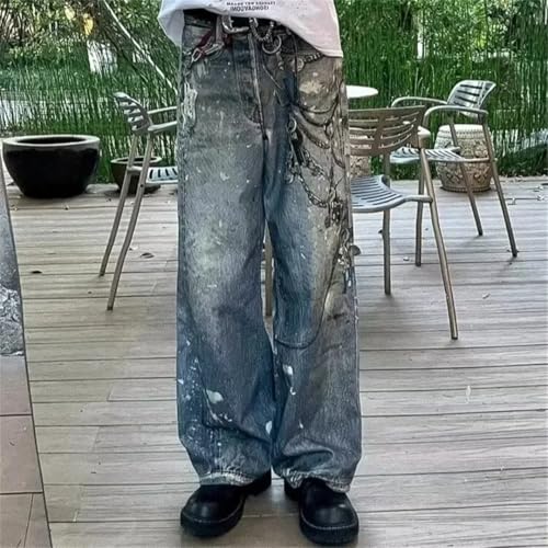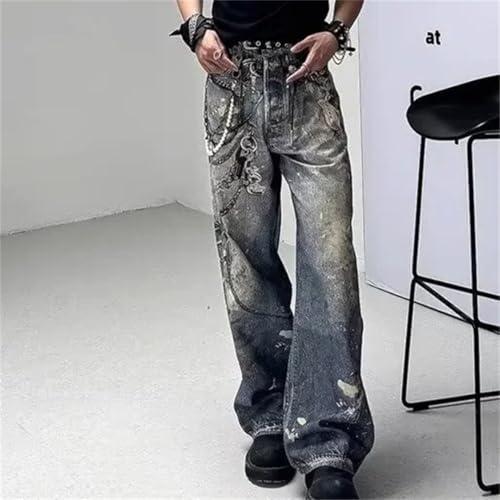 Men's Summer Loose-Fit Denim Pants with Chain Printing Sensibility High Street Vintage Jeans