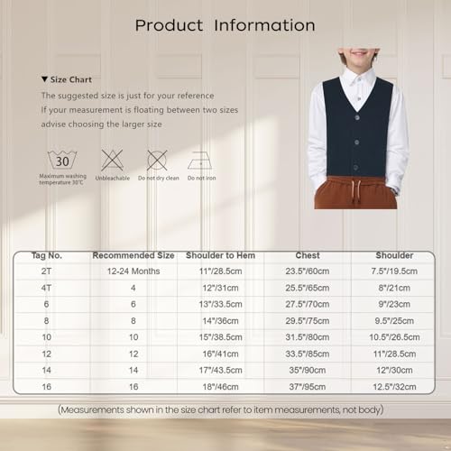 Fabric type: 100% CottonMade of pure cotton, the vest is breathable and soft, offering your child a comfortable wearing feeling, which is great for sensitive skinThe v-neck and sleeveless design is both contemporary and modern, following the current fashion trends, making your little boy stand out in the crowdButton closure adds a touch of sophistication and classic charm, presenting a well-dressed and elegant look for your childAvailable in a variety of colors such as navy blue, black, gray, light blue, apricot, and white, providing multiple choices to match different outfits and occasionsIdeal for formal events like weddings, celebrations, proms, graduations, or any other special gatherings where a refined look is required Perfect for everyday use. first-class materials and excellent craftsmanship ensure long-lasting durability.