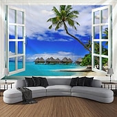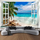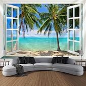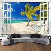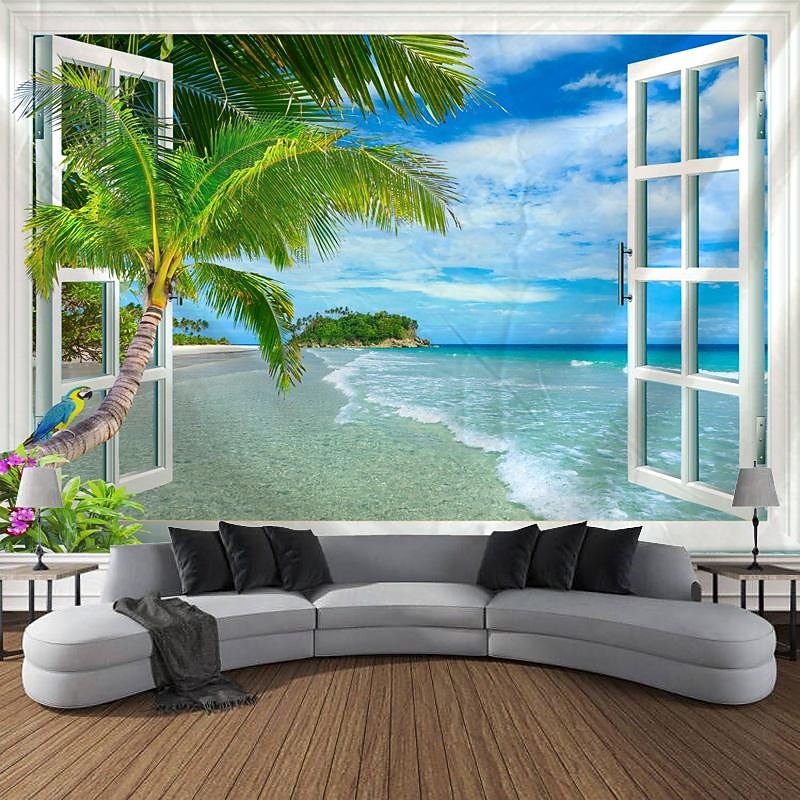 Beach Window View Hanging Tapestry Wall Art Large Tapestry Mural Decor Photograph Backdrop Blanket Curtain Home Bedroom Living Room Decoration